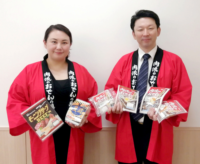 The new products are four items: “Oden Wiener”, “Nikumochi Gyoza”, “Funwari Irodori Age”, and “Uzura Niku Dango”. “Oden Wiener” adds the umami (deep flavor) of the meat to the taste of the katsuobushi dashi (bonito broth). “Nikumochi Gyoza” is characterized by its mochi-mochi (chewy) texture and retain the texture even after simmered for a long time. “Funwari Irodori Age” contains three kinds of vegetables and is characterized by funwari (fluffy) texture of tofu and chicken, which aims to solve the lack of vegetables in oden ingredients. “Uzura Niku Dango” is meat dumplings made with chicken with quail eggs. These are well received by buyers, and it is expected to revitalize the oden market.